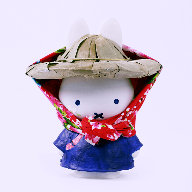 而身為客家人的我也希望藉由自己擅長的方式讓客家文化的特色展現在各個地方,於是讓米飛兔穿上客家傳統藍衫頭上戴著花布斗笠,好好感受一下這所謂的好客之島。